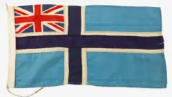 The ensign's field is light blue and has a dark blue Saint George's cross which is fimbriated white placed overall. The Union flag is in the canton.