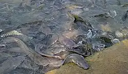 As a carnivore, it feeds on aquatic insects, young shrimp and smaller fishes.[3] However, it can also eat rice bran, kitchen refuse, fish meal, or formulated feeds.[4] In turn, the fish is attacked by Achlya, Aphanomyces, and Pythium.[6] In the wild, the fish spawns in small streams. The fish does not, however, spawn on its own in captivity. Spawning must be induced by injecting mature females with hormones. The eggs from the female are removed while milt, obtained from the reproductive tract of sacrificed males, are introduced. The resulting catfish larvae can be fed with newly hatched brine shrimp and water fleas four to five days after hatching. After more than one month, the fingerlings can be transferred to grow-out ponds.[4]