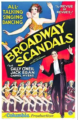 Broadway Scandals is an All-Talking 1929 American Pre-Code musical film. The film stars Jack Egan, Sally O’Neil and Carmel Myers. The sound was recorded via the Western Electric sound-on-film process.[1][2]