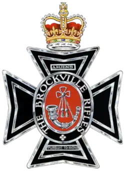 A hunting horn is hung from a silver cord in the center of a gules (red) background, all of which is in a silver-bordered black ring with "The Brockville Rifles" inscribed in silver, all centered on a silver-and-black Maltese cross whose upper branch reads "Amiens" and the lower branch reads "Pursuit to Mons," both in silver. Over the cross is a crown.[4]