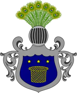 Description: A golden basket under three golden stars. Upon the helm seven green peacock feathers.