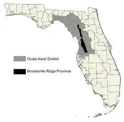 The Brooksville Ridge lies in a north-northwest to south-southeast line, extending from the edge of the Santa Fe River floodplain in eastern Gilchrist County through southwestern Alachua County, east-central Levy County, southwestern Marion County, and central Citrus and Hernando counties, to eastern Pasco County. The province is bordered on the west by several coastal karst plain provinces; the Wacassassa Flats, Gulf Hammock, Chrystal River Karst Plain, and Land O'Lakes Karst Plain provinces. It is bordered on the east by several inland karst plain provinces; the Williston Karst Plain, Tsala Apopka Plain, and Green Swamp provinces. The Brooksville Ridge province is divided into northern and southern segments by the Dunellon Gap, through which the Withlacoochee River flows, forming the boundary between Marion and Citrus counties.[3]