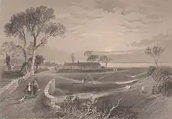The hamlet had a small cottage that acted as an inn of sorts, mainly used by drovers and those visiting the well seeking a cure. The inn, situated between two other cottages,[10] lay on the eastern side of the Raffles or Brow Burn and was demolished in 1863 when the road was widened. Robert Burns stayed at this hostelry whilst taking the waters from Brow Well and immersing himself up to the armpits in the waters of the Solway Firth.[11]