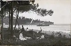 Picnickers at Browns Bay in the 1910s, with the Browns Bay Wharf and the SS Taniwha