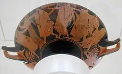 The exterior shows a procession of revelers (komos), the boisterous event which occurred at the end of a symposion. The komasts are largely naked, dressed in only a chlamys (cloak), and are crowned with grape vines. The cloaks are depicted with the scattered dots which are typical of the Brygos painter. One of the revelers plays the aulos (a double flute), another plays the barbiton (a type of lyre). The participants in the procession head off with bouncy steps. A few details, such as their headbands and vine wreaths are painted in the same red as their skin. the tondo image and the barbiton player are images which were often reproduced in the literary tradition and other media.[1]