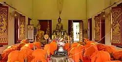 In all Theravada countries chanting, devotion (bhatti) and worship (puja) is a big part of lay and monastic Buddhist practice, and devotional chants which praise the qualities of the Buddha are widely used.[8] Likewise, worship (puja), bowing, making offerings to and revering Buddha statues on a shrine are also important practices for Theravada Buddhists.[9]