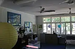 In 1959 another classroom building, Block C, was constructed. Highset on concrete posts, it was a timber-framed and weatherboard-clad building with an 8-foot (2.4 m) wide verandah on the north side used as circulation to a single, south-facing classroom 21 by 24 feet (6.4 m × 7.3 m). The earlier buildings on the site had been built parallel to the site boundaries but Block C disregarded this and was built at an angle to face directly north, which was characteristic of the standard type.[63] Designed by the Department of Public Works, the type (High Set Timber Building with Semi-enclosed Stair, F/T4) was introduced in c. 1950 and built into the 1960s. (Despite its name, the type did not always include a semi-enclosed stair.) This type was typically long buildings of multiple classrooms and it was planned for Block C to be extended on its eastern end with further classrooms but this did not occur.[64] Block C included typical variations of features introduced into later versions of the type - a bag-rack balustrade on the verandah and louvres in the verandah wall. In c. 1966 the original stair on the west side of Block C was removed and refixed on the northern side in a reconfigured L-shape with generous awning roof. In c. 1976 it was remodelled for administration use with partitions built to accommodate smaller offices. This work was reversed in c. 1986 with the partitions removed and the space reverting to a single classroom.[65][66][67][68] The understorey had a concrete floor and was used as semi-enclosed covered space with a perimeter bench seat. The southern and verandah walls were extensively glazed, providing abundant natural light and ventilation to the classroom.[1]