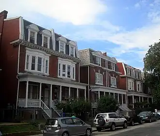 The Buildings at 1644–1666 Park Road NW are twelve semi-detached row houses in the Mount Pleasant neighborhood of Washington, D.C. They are typical of speculative row house development in the neighborhood.[2] The houses were designed in the Colonial Revival style by Washington architect Appleton P. Clark Jr., and completed in 1906. They are a few of such houses that he designed and exemplify his facility for eclectic design and sophistication.[2] The houses are three stories in height and the exteriors are covered in brick. They feature slate Mansard roofs and wooden front porches. The styles of the main facades alternate and contain shallow oriel windows, prominent dormers and curved pediments. They were listed in the National Register of Historic Places in 1986.[1]