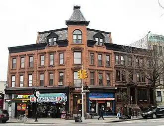 The buildings at 375–379 Flatbush Avenue and 185–187 Sterling Place are a historic group of four commercial and residential buildings located in the Prospect Heights neighborhood of Brooklyn, New York City. They were built in 1885 and are in the Neo-Grec style with Second Empire elements.[2] The 377–379 Flatbush Avenue building is a 3.5-story masonry structure with a commercial ground floor, apartments above, and a distinctive corner tower with pyramidal roof. It features a mansard roof. The 375 Flatbush Avenue building is a commercial/residential structure identical in form to 377–379 Flatbush Avenue, but without a mansard roof. The 185–187 Sterling Place buildings are two single family row houses built as companions to the other buildings.[3]
