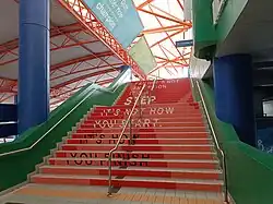 The station originally featured a similar design and ambience with other LRT stations, with roofs supported by latticed frames, and white plastered walls and pillars. It received a facelift in conjunction with the 2017 SEA Games and the renovation of the National Sports Complex as KL Sports City, being revamped with a sporting theme. The revamp features colourful and vibrant graphics, sports symbolisms, and inspirational quotes installed inside and outside the station, such as on the walls and staircases. The floor itself is painted to emulate a relay track, with the faregates acting as the end/beginning of the painted track.[3]
