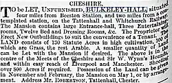 Thomas Orton (1747-1822) was the son of Thomas Orton and Martha Bulkeley, Thomas Bulkeley’s sister. In 1787 he married Betty Sandbach (1764-1827) who was the daughter of William Sandbach of Tarporley. The couple had two sons and five daughters. The Orton family mainly lived in Bank House in Tattenhall. When Thomas died in 1822 he left all of his estate in Trust[4] mainly for the benefit of his two sons Robert Bulkeley Orton (1790-1866) and Thomas Orton (1802-1855). Both were unmarried and had no heirs so when Robert died in 1866 all of the property was sold. It was bought by Robert Barbour of Bolesworth Castle.[5]