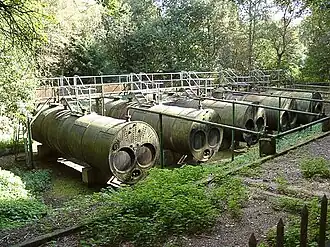 The incline was used during the construction of the Bulkeley Hill Reservoir and the water pipeline to overcome a height difference of about 345 feet (105 m).[5] It has three catch points for derailing runaway vehicles. At its bottom station, five reused Lancashire boilers are available as diesel storage tanks for the pumps.[6][4]