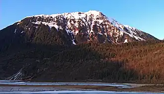Bullard Mountain is a 4,225-foot (1,288 m) mountain summit located in the Boundary Ranges, in the U.S. state of Alaska.[3] The peak is situated immediately east of the terminus of Mendenhall Glacier, within Tongass National Forest, 9 mi (14 km) north-northwest of Juneau, and 6 mi (10 km) northeast of Juneau International Airport. McGinnis Mountain lies 3.7 mi (6 km) on the opposite side of the glacier, and Heintzleman Ridge lies 2.75 mi (4 km) to the south. Bullard Mountain is often seen and photographed with Mount Wrather, a 5,968-foot (1,819 m) summit 3.9 mi (6 km) to the north because they are together in the background behind Mendenhall Lake, a popular tourist and recreation area. Although modest in elevation, relief is significant since the mountain rises from this nearly sea-level lake in less than two miles. Precipitation runoff from the mountain drains into the lake via Nugget Creek and Nugget Falls. Bullard Mountain is named for Benjamin Bullard (1848-1933), a mining engineer who, in 1907, began mining on Nugget Creek where he later built a hydroelectric power plant.[4]