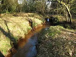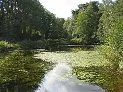 Pirbright has two communities: army training barracks and designated homes are north of a London main axis (south-west) railway and the slightly dispersed village is south. The village is almost entirely surrounded by heathland, much of it owned by the Ministry of Defence and used by the Army Training Centre Pirbright.[3][4] The south and south-east of the parish is mostly woodland and has three small farms. The south-west of the parish has a large military training area, Pirbright Common. Near to the church are several features due to Stanley's association with the village: Hodge Brook is equally marked as Congo Stream, between Ruwenzori Hill and Stanley Hill. Mazamboni Farm is next to Aruwimi Wood.