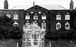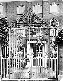 The central part of the house, and probably the oldest, was ornamented by brick pilasters. The entrance hall was of Purbeck stone with a fireplace decorated with Flemish tiles. In the early 1900s, the kitchen still had a roasting spit that was thought to be 200 years old and a deep well that still provided water. The drawing room was on the first floor with three round-headed windows and a chimney-piece in white marble showing Alexander the Great. Above the drawing room were the bedrooms. One room contained a fireplace with the initials BDM for Benjamin and Margaret Deicrowe.[7] A noted feature of the house was its iron gates, believed to have been made by the blacksmith Thomas Warren (1673-1736).[9]