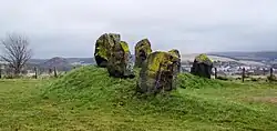 Dalmellington[5] is an ancient settlement of indeterminate origin. It is probable that the area was first occupied some 6,000 years ago, when humans moved inland from the West Coast along the rivers. It was certainly occupied by the Neolithic Period, as cairns and a few scraps of tools from this period have been found. In recent years traces of early human activity have been found around Loch Doon. There may have been crannogs at Bogton Loch and Loch Doon. In the medieval period Dalmellington was part of Kyle Stewart and under the rule of a series of Norman lords, invited to Scotland by the king to assist in subduing the country. On behalf of the king they collected taxes and administered justice. It was during this period that "The Dalmellington Motte" was constructed.[6]