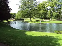 The park was designed by Edward Milner for the Buxton Improvements Company, following the arrival of the railway to Buxton in 1863. It was opened in August 1871 on a 12-acre site (on the land of the Hall Gardens, given by the 7th Duke of Devonshire) and in 1876 was extended to its present 23 acres of gardens and lakes. There was originally an admission charge to enter the gardens via a ticket office with turnstiles. Milner's design was a development of the 1830s landscape design of the Serpentine Walks (along the River Wye) by Joseph Paxton for the 6th Duke of Devonshire, on what was previously the private gardens of Buxton Old Hall. The three original rustic bridges were removed in Milner's design, with the introduction of ornate iron footbridges, the main one known as the Milner Bridge.[1][6]