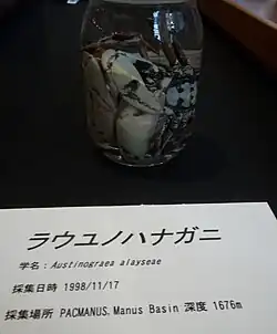 - ^ Lee, Won-Kyung; Kim, Se-Joo; Hou, Bo Kyeng; Dover, Cindy Lee Van; Ju, Se-Jong (2019-04-24). "Population genetic differentiation of the hydrothermal vent crab Austinograea alayseae (Crustacea: Bythograeidae) in the Southwest Pacific Ocean". PLOS ONE. 14 (4): e0215829. Bibcode:2019PLoSO..1415829L. doi:10.1371/journal.pone.0215829. ISSN 1932-6203. PMC 6481846. PMID 31017948.