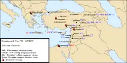 In 629, conflict between Byzantine Empire and Arabs started when both parties confronted in the Battle of Mu'tah. Having recently converted to Islam and unified by the Islamic Prophet's call for a Jihad (struggle) against the Byzantine and Persian Empires, they rapidly advanced and took advantage of the chaos of the Byzantine Empire, which had not fully consolidated its re-acquisitions from the Persian invasions in c. 620. By 642, the Empire had lost Egypt, Palestine, Syria and Mesopotamia.[8] Despite having lost two-thirds of its land and resources (most of all the grain supply of Egypt) the Empire nonetheless retained 80,000 troops, thanks to the efficiency of the Thema system and a reformed Byzantine economy aimed at supplying the army with weapons and food.[9] With these reforms, the Byzantines were able to inflict a number of defeats against the Arabs; twice at Constantinople in 674 and 717 and at Akroinon in 740.[10] Constantine V, the son of Leo III (who had led Byzantium to victory in 717 and 740) continued the successes of his father by launching a successful offensive that captured Theodosioupolis and Melitene. Nonetheless, these conquests were temporary; the Iconoclasm controversy, the ineffective rule of Irene and her successors coupled with the resurrection of the Western Roman Empire under the Frankish Carolingian Empire and Bulgarian invasions meant that the Byzantines were on the defensive again.
