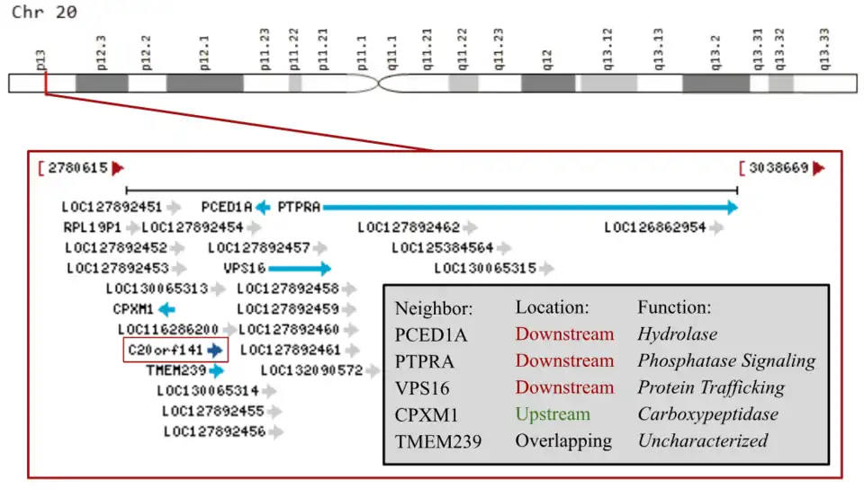 Human c20orf141 spans 5,136 base pairs, from positions 2,795,614 to 2,800,930 on the plus strand of Chromosome 20 (20p13). [8] It sits downstream of a carboxypeptidase-encoding gene and upstream of a vacuolar protein sorting gene.[5] C20orf141 sits upstream of PC-Esterase Domain Containing 1A (PCED1A), Receptor-Type Tyrosine-Protein Phosphatase Alpha (PTPRA), Vacuolar Protein Sorting Protein 16 (VPS16).[6] C20orf141 is also downstream of Carboxypeptidase X1 (CPXM1) and overlaps with Transmembrane Protein 239 (TMEM239).[6]
