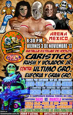 The CMLL Día de Muertos(2017) (Spanish for "Day of the Dead") is professional wrestling supercard event scripted and produced by the Mexican Lucha Libre promotion Consejo Mundial de Lucha Libre (CMLL). The show took place on November 3, 2017 at CMLL's main venue, Arena México, in Mexico City, Mexico and celebrated the Mexican Day of the Dead holiday that ends on November 2 each year. For the event several wrestlers wore traditional Día de Muertos face and body paint. From the fourth match on the losing wrestlers would be dragged to El Inframundo ("The Underworld"), a side entrance in the arena. by a group of wrestlers dressed up as minions of the ruler of the underworld.