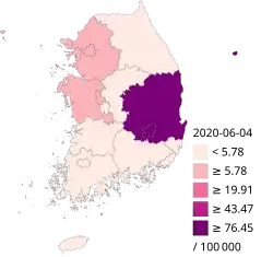 ![]() Coronavirus pandemic in South Korea over time (since 20 January 2020). Day not included in map Day included in map Last day included in map | |