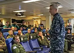After several weeks in the eastern Mediterranean, Charles de Gaulle proceeded to the Atlantic and North Sea for naval exercises alongside her battle group, which consisted of the air-defense frigate Chevalier Paul, the anti-submarine frigate La Motte-Picquet, the command and replenishment ship French tanker Somme, and a nuclear-powered submarine.[9] From 13 to 15 March, Charles de Gaulle was docked in Brest for a brief port visit. The enactment of a strict lockdown to combat the ongoing coronavirus pandemic came two days after the ship left Brest, and the sailors were allowed shore leave that included seeing family members and visiting local commercial establishments.[7][10] Charles de Gaulle's crew did not have contact with the outside world for the next three weeks.[11] Belgium's frigate Leopold I, part of the carrier battle group, was ordered to prepare to leave the force on 24 March after detecting a single coronavirus case.[8][12] The nature of warships, which includes working with others in small enclosed areas and a lack of private quarters for the vast majority of crew, lent themselves to the rapid spread of the disease to a degree even greater than that seen on cruise ships.[13] Indeed, on Charles de Gaulle there were places where 20 people would sleep together on three or four floors of berths.[14]