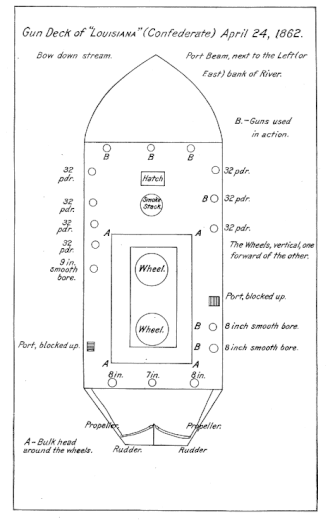 At this time, the main engines of Louisiana had been installed, but those for the screws, needed for steering, had not. Furthermore, the main engines were found to be inadequate; even at dangerously high boiler pressure, she could barely make headway against the river current. Unable to move on her own, she had to be towed down to the forts, with workmen still aboard. There she was tied to the left bank (near, the north side of the river) a short distance above Fort St. Philip. This did not completely mollify General Duncan, who wanted the ship to be positioned below the forts, but Commander Whittle would not risk his vessel, with its unarmored deck, against the plunging fire of the Union mortars. She remained at this position throughout the ensuing battle.[4]
