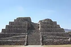 Six bodies comprise the pyramidal basement; at the top are remains of a building. The patio geometry in relation to the plaza-esplanade and eastern road denotes the domain reached by the Toltec-Chichimec architects in design and construction. The top building was divided into two sections by a central staircase, similar to late postclassical Aztec structures. It was built with stone walls plastered with mud and stucco (mixture of lime and sand) and painted red oxide (towards its penultimate occupation) and ochre (last). Indicated by remains at the southwest corner of one of the rooms that still exist, miraculously if we consider that in the late 1940s it was dynamited during an alien occupation, losing much of northwest side corner.[6]
