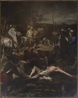 In 1667, he received a commission to create four large canvases on the Passion of Christ for the chapel of the Christ of Sorrows of the Third Order of Saint Francis, for which he would be paid 1,550 reales each. They were completed the following year and constitute the only full set of works he is known to have produced.[2] They show the influence of Flemish art. Six smaller works in the sacristy were attributed to him by the art historian, Antonio Palomino, but this has been questioned. He also executed three canvases in collaboration with José Jiménez Donoso. It is likely that he also painted some frescoes, although none have survived.[3] An oil painting of the Pentecost is preserved at the Abbey of Santo Domingo de Silos, along with The Communion of Saint Teresa.