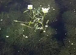 The 0.6–1.5 cm wide flower[5] floats on the water surface, or extends beyond it.[11] It has white, 5–12 mm long, and 2–7 mm wide sepals, and white, 4–12 mm long, and 2–5 mm wide petals.[4] The androecium consists of (3–4–)6 stamens.[5] The gynoecium consists of 2–3 carpels.[9] The 8–8.7 mm long, and 2.1–2.3 mm wide fruit bears ovoid to oblong, 1.5–3 mm long, and 1–2.2 mm wide seeds.[5]