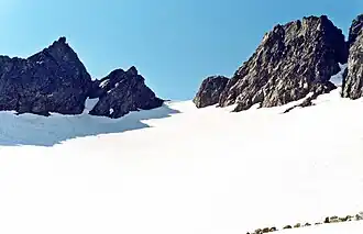 Cache Col is a gap in a high ridge between Magic Mountain and Mix-up Peak. It's located at the highest part of Cache Glacier, on the shared boundary of Skagit County and Chelan County in Washington state. Cache Col is situated south of Cascade Pass on the shared border of North Cascades National Park and Glacier Peak Wilderness. Cache Col and the Cache Glacier are at the northern end of the Ptarmigan Traverse which is mountaineering route that provides access to remote peaks such as Mount Formidable and Dome Peak. Precipitation runoff on the north side of the col drains into the Stehekin River, while precipitation drains into the Cascade River from the south side.