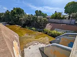 Thirty-two percent of its length, approximately 4.2 miles, is classified as "hard bottom" and the reach between Highway 101 and Lawrence Expressway is a trapezoidal, concrete-lined channel. From Guadalupe Slough to Highway 101, Calabazas Creek is an enlarged earthen channel with levees.[5] In 2010, the Calabazas Creek Flood Control Project was started by the Santa Clara Valley Water District (SCVWD) to enlarge the culvert undercrossing at Saratoga-Sunnyvale Road, widen the Union Pacific Railroad (UPRR) bridge, and construct a detention area adjacent to the creek north of Saratoga-Sunnyvale Road, with bank erosion repair at dozens of locations along 3.7 miles of the creek from Miller Avenue to Wardell Road (and was extended to include the Comer Debris Basin and Comer Drive.[10] The culvert at Saratoga-Sunnyvale Road was widened and the upstream detention basin completed in September, 2011.[11]