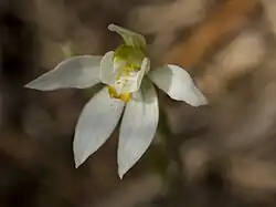 There are one or two white, orange-tipped flowers on a thin, wiry, sparsely hairy spike 5–22 cm (2–9 in) high, each flower 15–20 mm (0.6–0.8 in) wide. The dorsal sepal is erect in the lower part but curves forward, partly covering the column. It is oblong, 7–10 mm (0.3–0.4 in) long and 2 mm (0.08 in) wide. The lateral sepals are narrow lance-shaped, 7–10 mm (0.3–0.4 in) long, 2.5 mm (0.1 in) wide, turn downwards and are usually parallel to each other. The petals are about the same size as the sepals and spread widely or turn downwards. The labellum is egg-shaped, about 5 mm (0.2 in) long, 6 mm (0.2 in) wide with three lobes. The lateral lobes are erect, surround the column and have slightly wavy edges. The mid-lobe is triangular, curves downward with up to 3 pairs of short, orange calli along its edge. There are two rows of calli along the centre of the labellum. The column is pale green is broad with broad wings. Flowering occurs from August to November but the flowers are self-pollinating and are only open for up to four days.[2][3]