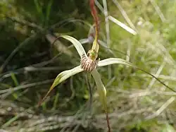 - Caladenia exilis Hopper & A.P.Br. subsp. exilis[6] - salt lake spider orchid, has white to greenish-cream flowers with pale maroon markings.[2][3][4]