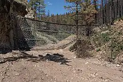 A heavy gauge metal barrier protects Forest Road 263 and the canyon west of Montezuma, New Mexico, added as a method of flood and debris control following the fire.