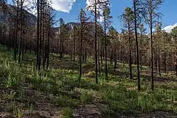 Partially burned forest along trail 223 in the Pecos Wilderness. Hermits Peak is visible in the distance