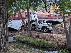 Workers from the city of Las Vegas, New Mexico dumping stone and earth to form a breaker to reinforce a bridge from potentially hazardous post-fire flooding of the Gallinas creek.