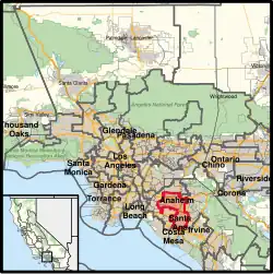 Due to redistricting after the 2010 United States census, the district moved East to parts of Orange County such as Anaheim and Santa Ana.