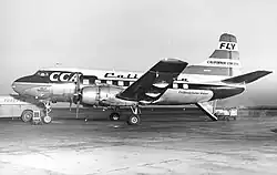 CCA started with four Douglas DC-3s and by January 1951, CCA/ATC had eight DC-3s and two DC-4s, one of which was contracted to the government supporting the Korean War.[13] The airline upgraded to five Martin 2-0-2s (billed as "Martinliners") in 1951, sourced from Northwest Airlines.[14] The 2-0-2s had tricycle landing gear and were significantly faster than DC-3s. An Aviation Week article says CCA sold four DC-3s to local service carrier Parks Air Lines immediately before Parks finally started service in 1950.[15]