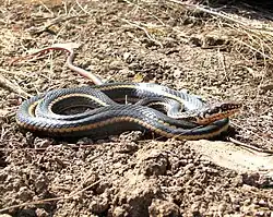 The California whipsnake (Masticophis lateralis), also known as the striped racer, is a colubrid snake found in habitats of the coast, desert, and foothills of California.