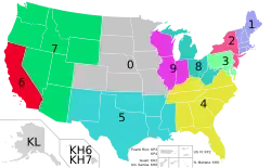 United States amateur radio call signs consist of one or two letters, followed by a single digit, and closing with one to three more letters.[21] The number in the call sign indicates in which of the ten U.S. radio districts the license was issued. (It is no longer necessary for U.S. amateur radio operators to change their call signs after moving into a new district.) Most amateurs going to an exotic location will add a "/location" suffix to show their current operating site, for example, a station visiting American Samoa might sign "(regular call sign)/KH8". American amateurs are permitted to operate in Canada under their own call signs with a location indicator.