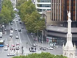 Twin skyscrapers designed by Antonio Lamela and finished in 1976, the Torres de Colón are at number 31, at the corner with the Paseo de la Castellana near the Plaza de Colón.[8] José Luis Sánchez Fernández's sculpture Herón is situated outside, and in an island halfway across the road is Woman with Mirror, donated by Fernando Botero as the most popular piece from his 1994 exhibit.[9]
