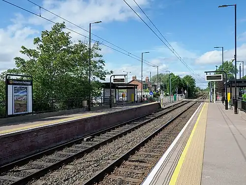 Both platforms have ticket machines (which accept cash, card and contactless payment), smartcard validators, sheltered waiting area, seating, next train audio and visual displays, timetable and information posters and an emergency help point.[10][11][12]