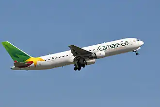 The Cameroon Airlines Corporation, trading as Camair-Co, is an airline from Cameroon, serving as flag carrier of the country, a role which was previously filled by the now-defunct Cameroon Airlines.[1] Camair-Co has its headquarters in the Immeuble La Rotonde in Douala,[2] and operates out of Douala International Airport.[3] The airline has never made a profit, and is struggling under the weight of its debts; most of its aircraft are currently grounded.[4][5] The company slogan is French: L'étoile du Cameroun, The Star of Cameroon.
