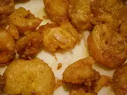 Camaron rebosado is prepared by removing the heads, and sometimes the tails as well, of the shrimp.[5] It is then sliced lengthwise along the back and butterflied, with the vein removed.[6][7] The shrimp is then marinated for a few minutes in a mixture of calamansi juice, salt, black pepper, garlic, and other spices to taste. The batter is made by mixing flour with egg, black pepper, corn starch or baking powder, and water.[7][8][6][4] The shrimp is coated evenly and then fried in hot oil.[7][8] It is also common to coat the shrimp in bread crumbs before frying.[9][10]