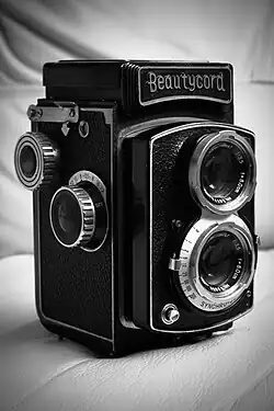 In the early 1950s Taiyōdō Koki made various types of cameras beginning with sub-miniatures[6] followed by a 6x6 folder and SLR, but were best known for TLRs given names that were variations of Beauty (e.g. Beauty, Beautyflex,[7] Beautycord). These were sold from their Tokyo shops mainly to US troops, exported to North European countries, the US,[8] Asia[9] and South America.[10] They were also rebadged for sale outside of Japan by the Dutch importer Fodor (Fodorflex), Miller-Outcult (Milo 35) and the United States Camera Corporation of Chicago (USC Auto 50), plus the mail-order giant Ward Montgomery (Wardflex) in the USA. Taiyōdō Koki also rebranded some of their products under the name "Gen" for sale in Canada,[11] and "CSL Photoflex" (the market for which is a mystery).