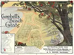 The Johnston family sold the farm to a farmer named Mr. Cave in 1888,[32] around the time that orchards became an important feature of the farm.[37] In 1894, Mr. Cave sold the property to Duncan Campbell, well known for his Auckland shoe store, after which the bay became known as Campbells Bay.[32][38] In 1912, the farm was subdivided, and Campbells Bay became a popular spot for holidayers, due to its relative proximity to the terminus for the Milford to Bayswater tram. Holiday baches were built in the area until World War I stopped the construction of new baches.[32][38] In 1914, a portion of the Takapuna Domain became the Pupuke Golf Club,[39] and from 1920 better roading in the area led to the construction of permanent homes.[32]