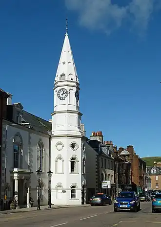 The original timber spire was replaced by a stone structure to a design by John Brown of Inveraray in 1778 and, a clock, designed and manufactured by John Townsend of Greenock, together with a bell, cast in Bristol, were installed in a new tower in 1779.[2] Following a critical report by a prisons inspector, the prisoners in the cells were relocated to a new prison facility in Castlehill in 1848,[5] and the building was extended by one bay to the southwest to a design by Campbell Douglas in 1866. The extra bay contained a portico formed by Doric order columns supporting an entablature on the ground floor, and by a round headed window, containing the burgh coat of arms in the tympanum of the window, on the first floor. There was a dormer window at roof level. The interior of the building was also remodelled at that time with the disused prison cells being converted to form a council chamber.[2] The building continued to serve as the meeting place of the burgh council for much of the 20th century but ceased to be the local seat of government when the enlarged Argyll District Council was formed in 1975.[6][7]