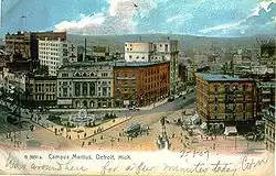 Cadillac Square in 1899, City Hall is on the left and the Majestic Building is to the right -